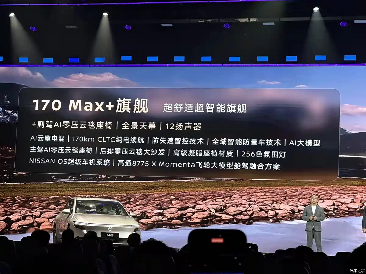 In terms of driver assistance, the mid-to-low-end Nissan N6 models are equipped with 5 cameras and 3 millimeter-wave radars, enabling Level 2 driver assistance functions; the top-of-the-line model will be equipped with 7 cameras, 1 in-vehicle camera, 12 ultrasonic radars and 3 millimeter-wave radars, combined with the 8775 chip and Momenta flywheel large model, enabling high-speed navigation assist (NOA), city memory navigation assist and all-scenario parking assist.